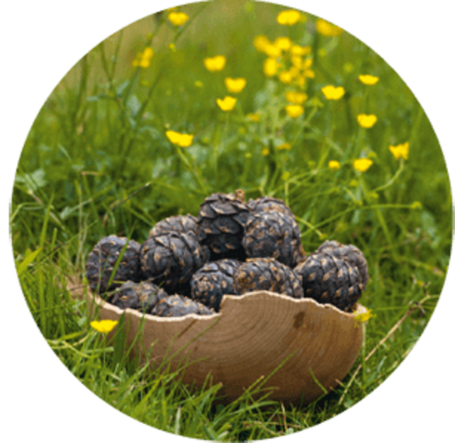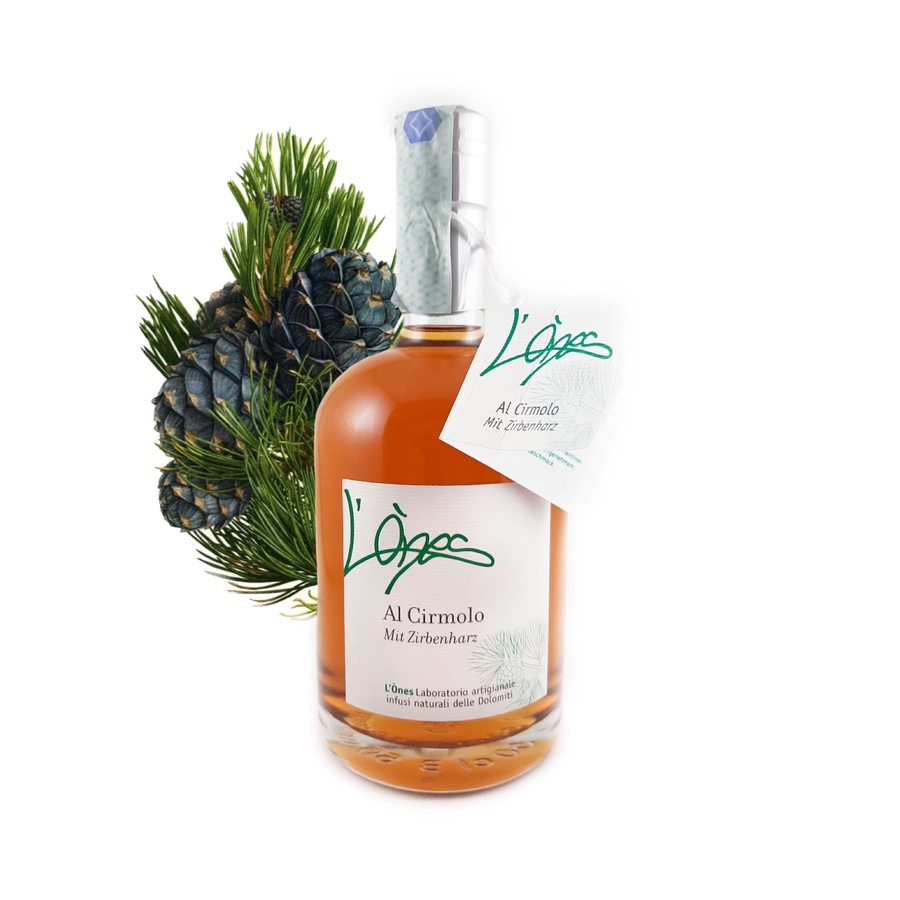Infuso naturale a base di grappa Trentina, ottenuto mediante macerazione di pigne di Pino Cimbro (Cirmolo) con estrazione naturale delle resine.