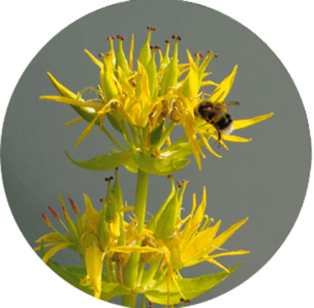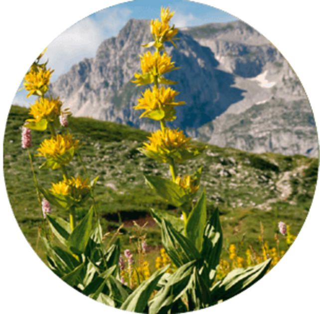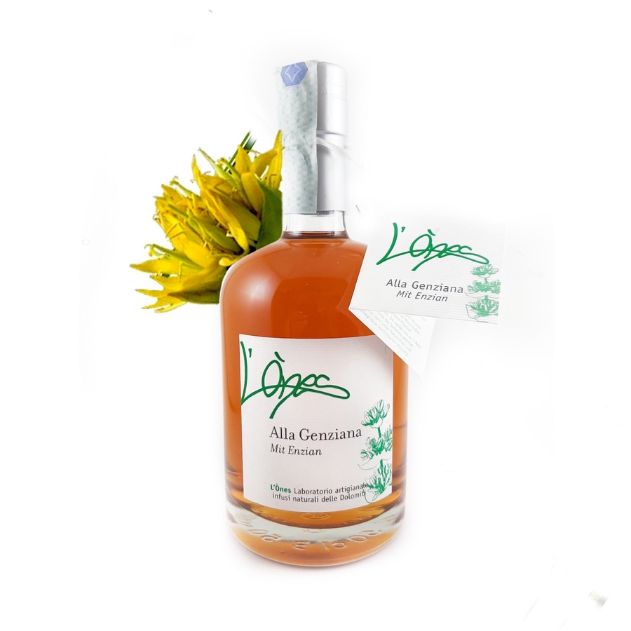Infuso naturale a base di grappa Trentina e radice di genziana maggiore, grande pianta erbacea e perenne di lenta crescita, tipica dei pascoli di alta montagna, alta 80-120 cm con grandi foglie opposte dal colore verde-bluastro, fiorisce tra luglio e agosto con fiori di colore giallo oro.